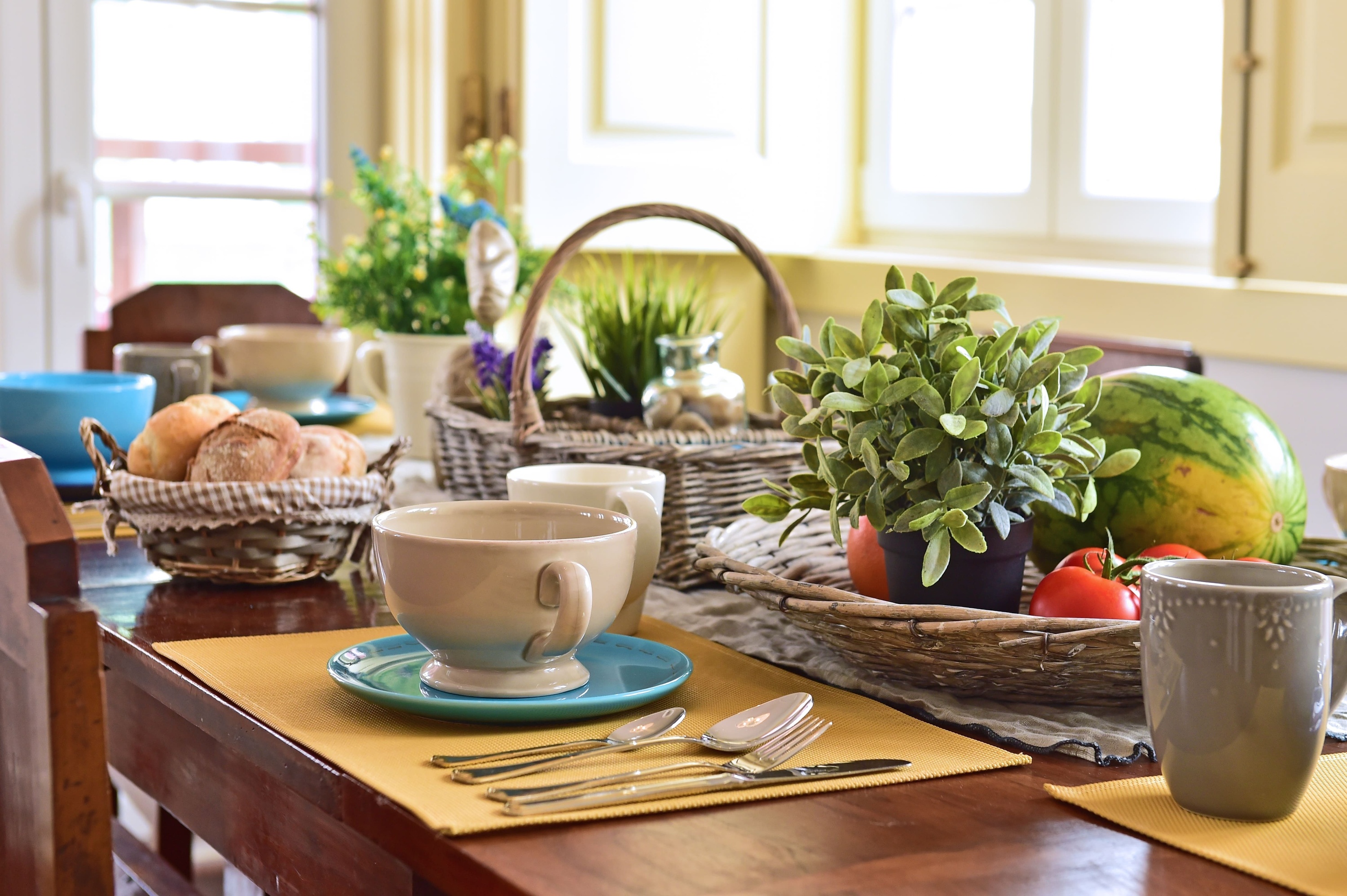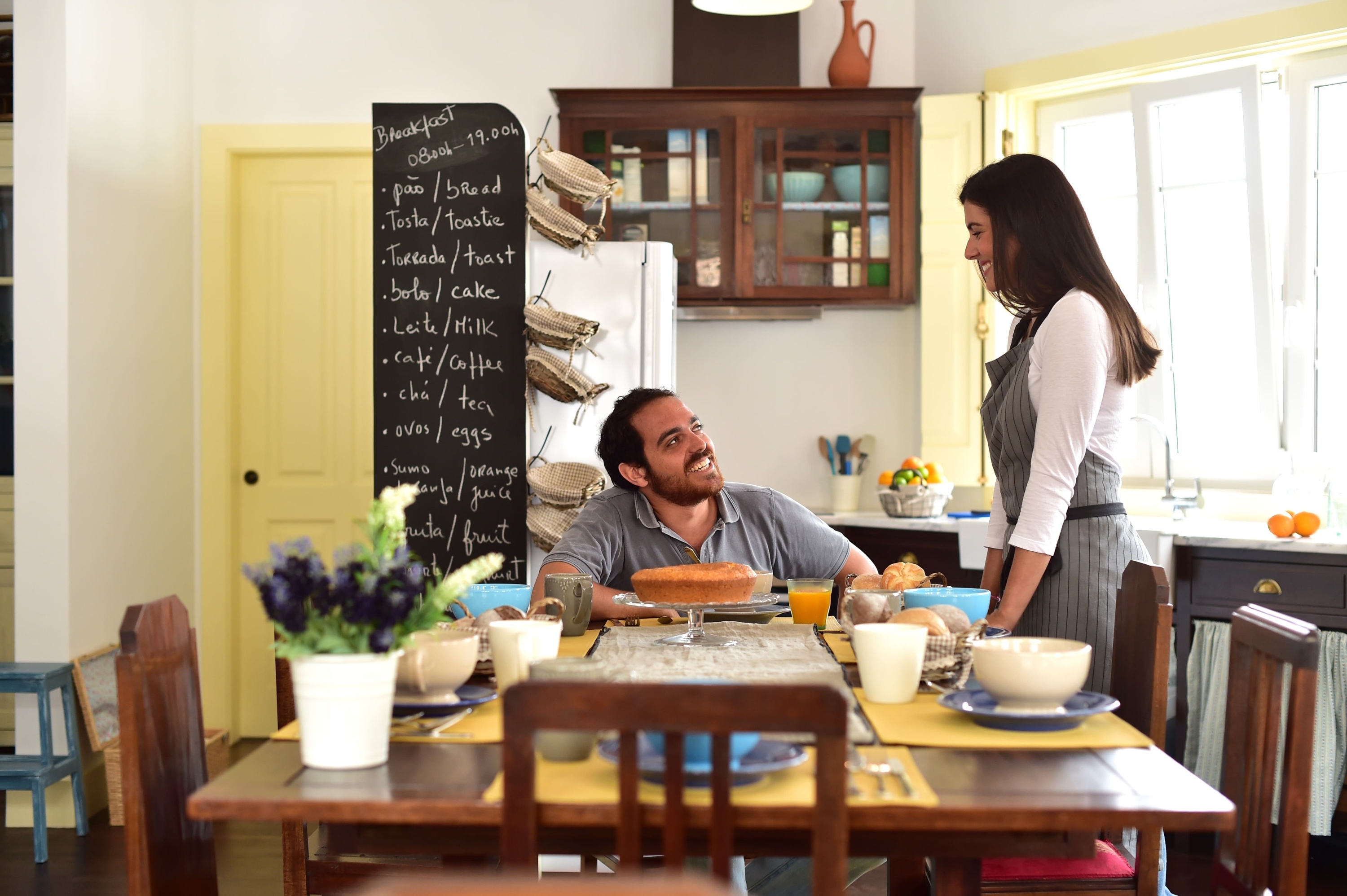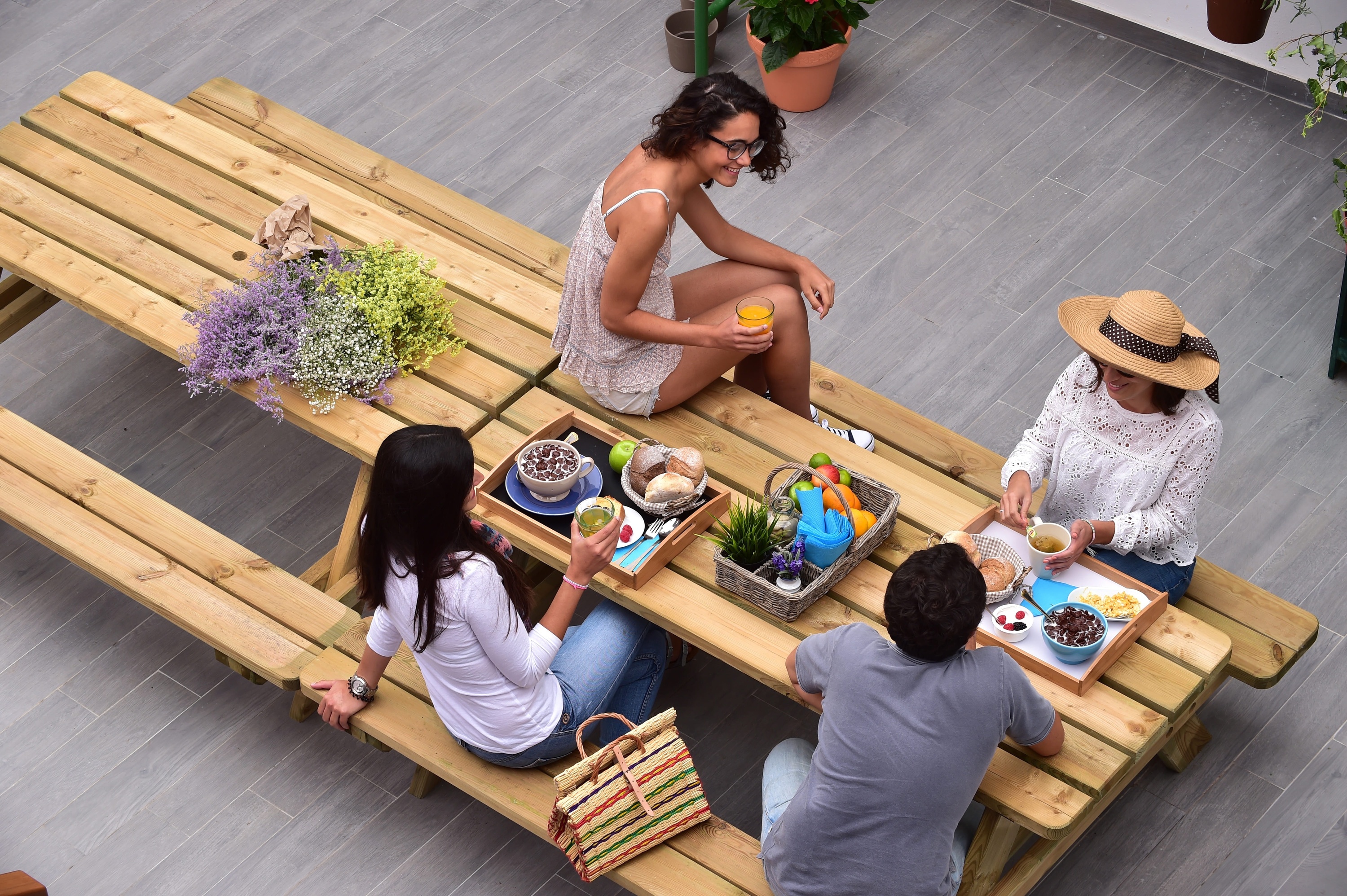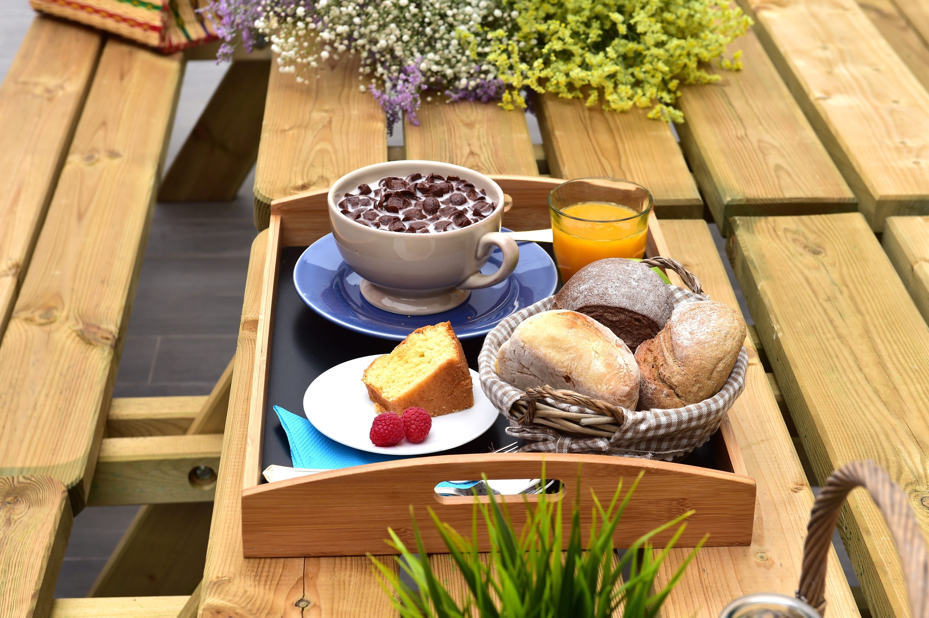 Pode desfrutar da sua refeição na sala de estar, no terraço ou no pátio, durante todo o dia.